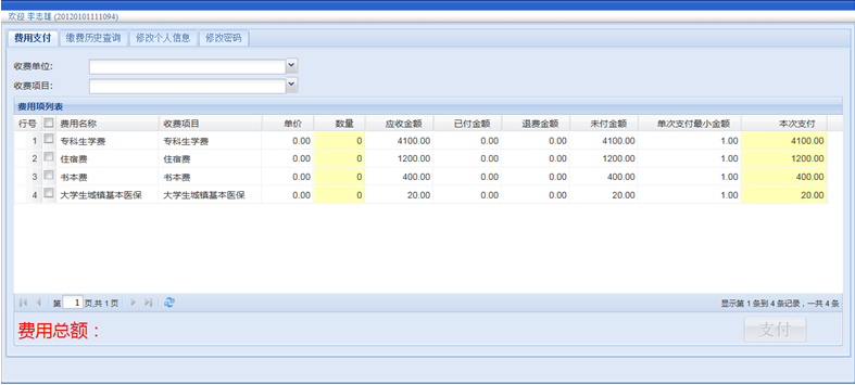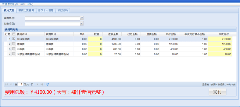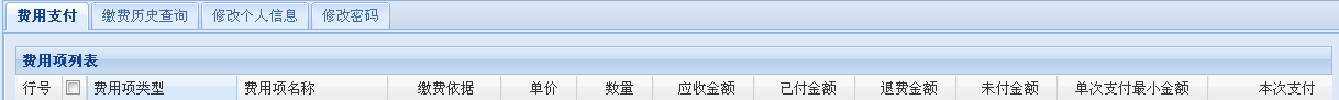 在 “费用支付” 功能菜单下的“费用项列表”中列出了该用户应缴纳的所有费用项。其中包含:
