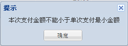等信息。点击每一个标题,“费用项列表”都会按照该标题重新排序。本系统支持部分缴费,可在 “本次支付” 下(颜色表示为浅黄色)直接编辑要缴纳的金额,当 “单次支付最小金额” 不为0时 “本次支付” 下输入的金额不能小于 “单次支付最小金额” 的金额,否则会弹出提示如图2-2所示。