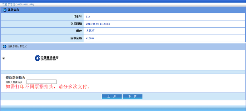 系统进入图2-5 支付界面后会自动生成“订单号”,“交易时间”,“币种”和缴费金额。用户可以选择“支付方式”。网上缴费请选择“在线支付”。在“合作银行”中在选择支付银行。然后点击 “下一步”,会根据你所选择的银行进入该银行的支付界面。
