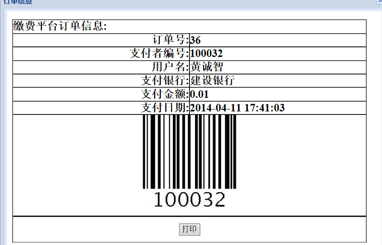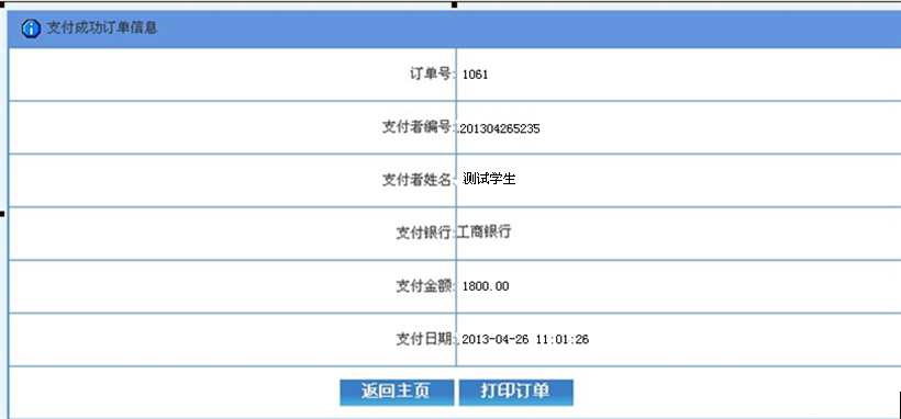 在网银缴费成功后会产生相应的订单信息如图2-7。